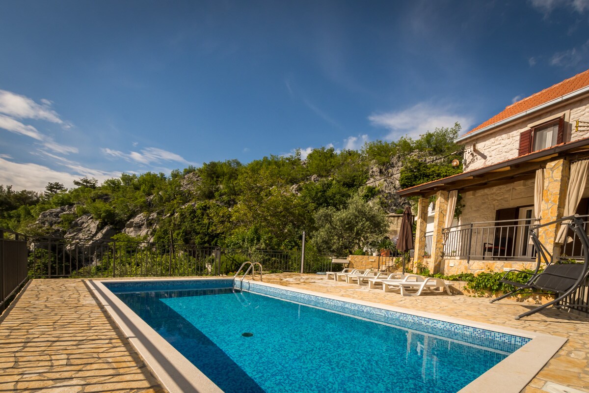 Villa Nacle is a modern private villa with heated pool located in the peaceful village of Naklice near Omiš and 7 km from the Adriatic coast. Designed for up to 6 guests, the villa offers three air-conditioned bedrooms, spacious living areas and a beautiful outdoor terrace with mountain views. Close to beaches, rafting and zipline on the Cetina River, it is ideal for families and couples seeking comfort, privacy and an active Dalmatian holiday.