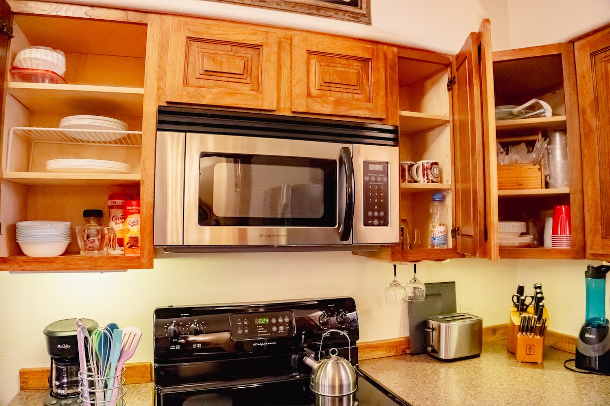 Step back into a simpler place and time! Our cabin is located in a quiet neighborhood on a quarter acre lot. Remodeled for comfort and enjoyment, but still has that rustic charm to give you the perfect mountain getaway! Get a great night’s sleep on our King Serta Perfect Sleeper. While additional guests choose from the XL memory foam twin or sofa bed. Our kitchen is fully stocked for you to cook your own meals, and we have plenty of games to keep you busy!