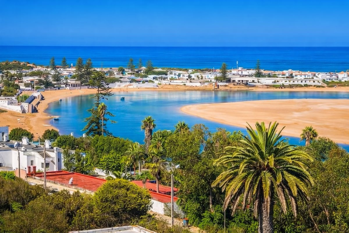 Duplex avec vue lagune & océan – Oualidia À moins de 10 min à pied de la plage, ce duplex lumineux offre une vue panoramique sur la mer et la lagune. Il comprend 3 chambres dont une suite parentale, un grand salon convivial et une terrasse idéale pour admirer le coucher du soleil. Alliant confort moderne, décoration soignée et emplacement privilégié, il promet un séjour inoubliable à Oualidia.