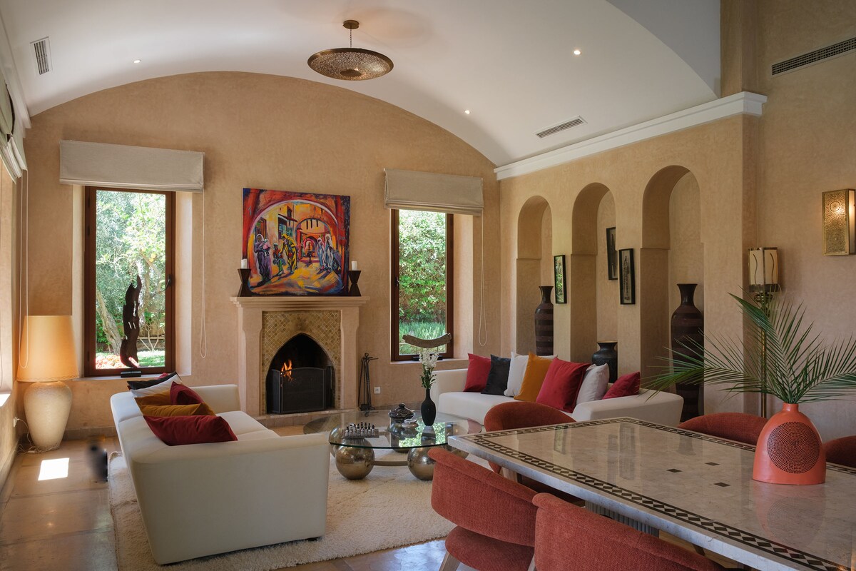 Χειροποίητη με τοίχους pisé, βίλα σε μαροκινό στυλ σε μια ειρηνική όαση, στα περίχωρα του Μαρακές, μόλις 8,5 χιλιόμετρα μακριά από τη φασαρία της Μεδίνας. Ιδανική επιλογή για οικογένειες. Συγκεντρωθείτε ανάμεσα σε ελαιόδεντρα στο λυκόφως με τσάι ή κρασί, απολαύστε ιδιωτικά γεύματα (μαροκινή ή διεθνή κουζίνα), γυμναστείτε παίζοντας τένις ή απλά συγκεντρωθείτε για κάποια απογευματινή διασκέδαση στον κήπο ή στην πισίνα. Μπορούμε να οργανώσουμε εκδρομές, να προτείνουμε αγαπημένα εστιατόρια κ.λπ.