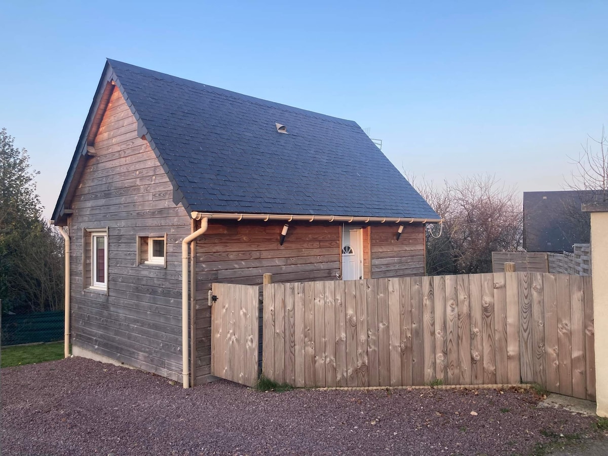 Chalet located in a famous seaside resort of the Côte de Nacre. In a dead end, 400 meters (5 minutes walk) from the beach, we propose you to stay in a wooden chalet of 40m2 (construction 2020) Fully equipped (storage, crockery, TV, internet, washing machine, fridge-freezer, microwave, induction hob, dishwasher). Ideal for a stay for 2 adults or for a family with 2 children. Supply of linen (sheets and towels) Animal allowed (only 1) specify this when booking