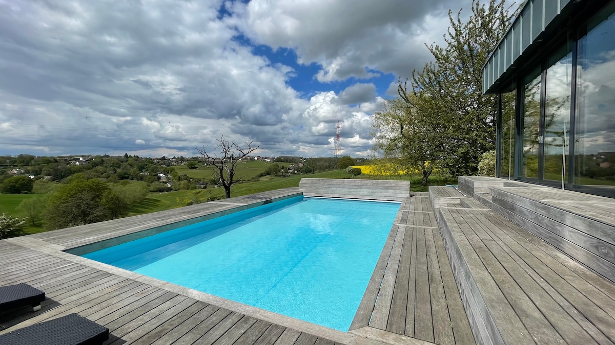 Endroit magnifique et luxueux, wellness, feu ouvert, piscine extérieure en été, spa de nage à contre-courant en hiver, jacuzzi extérieur, billard, fitness, salle à manger japonaise. Salon avec feu ouvert, cuisine confortable, véranda avec vue magnifique, 5 chambres chacune avec salle de bain privative. Jardin, bbq, meubles de jardin, séjour de minimum 2 nuits. Parking 5 voitures. Borne de recharge. Pas de groupe de jeunes (>30 ans). Possibilité suivant disponibilité de départ tardif le dimanche.