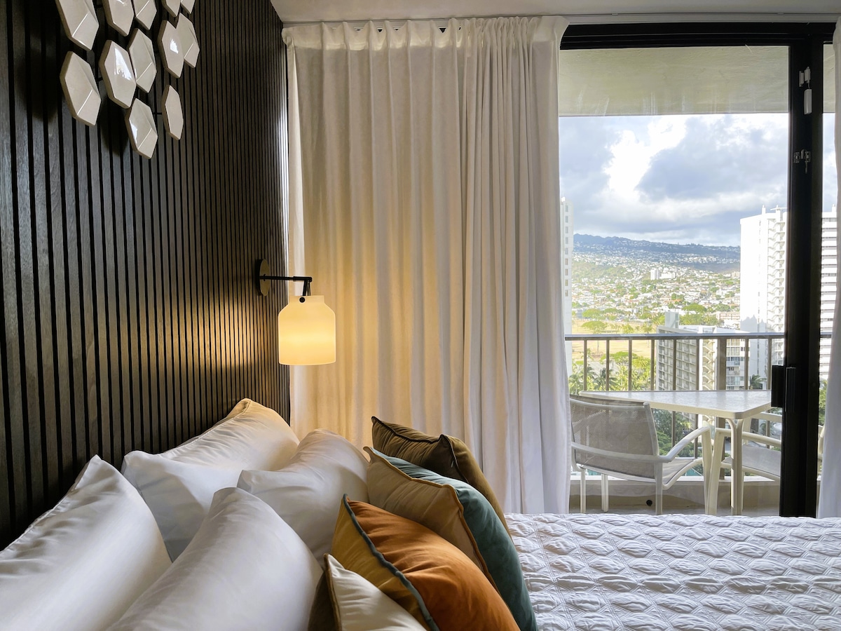 ΝΕΟ! Waikiki City View Studio. Αυτό το πρόσφατα ανακαινισμένο στούντιο προσφέρει 382 τετραγωνικά πόδια κομψού χώρου διαβίωσης με ευρύχωρο lanai, όπου μπορείτε να απολαύσετε εκπληκτική θέα στο βουνό και το βουνό Koolau και να απολαύσετε το γεύμα σας. Διαρρύθμιση ύπνου: • Μεγάλο κρεβάτι για απόλυτη άνεση • Δύο φουτόν σε ιαπωνικό στιλ διπλού μεγέθους Παροχές κουζίνας: • Ηλεκτρικός βραστήρας με δωρεάν αλεσμένο καφέ και τσάι ιβίσκου • Φορητή επαγωγική εστία για ελαφρύ μαγείρεμα • Πιάτα δείπνου, μπολ, φούρνος μικροκυμάτων και κελάρι κρασιών