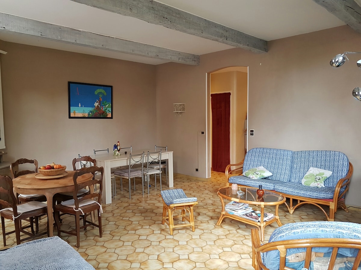 2 πολύ φωτεινά υπνοδωμάτια στο ισόγειο σε 50 m2 με μεγάλο μπάνιο (ντους και μπάνιο) τα δύο πρώτα υπνοδωμάτια με 1 κρεβάτι 140 (2 pl) και το δεύτερο 2 κρεβάτια 90 (1 pl). Έχετε μια κουζίνα εξοπλισμένη με νεροχύτη, με φούρνο, ηλεκτρικές εστίες 2φωτιές, κουκούλα, καφετιέρα λοβό malongo, ψυγείο, φούρνο μικροκυμάτων, πιάτα για 3 άτομα. Έχετε επίσης μια μεγάλη βεράντα με τραπέζι, καρέκλες, ομπρέλα και υπέροχη θέα στη θάλασσα.