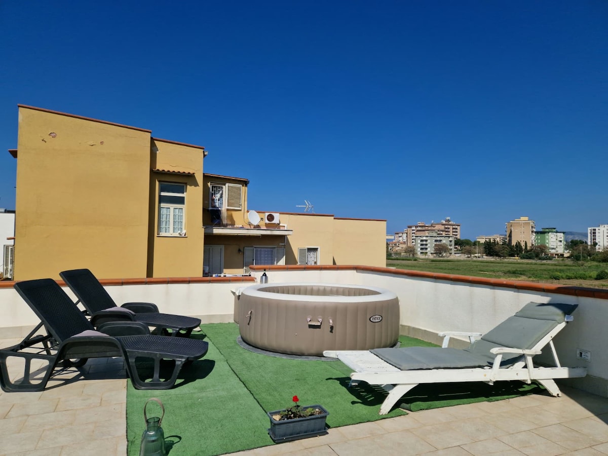 Mondello Pool & Suite is a vacation home in a villa with a large garden. 3 min driving (8 minutes walk) from the beach, 20 min from the airport and 15 min from the city center, it's the perfect place to spend your summer holidays and visit Palermo. The house consists of bedroom, bathroom and kitchen, living room with sofa bed and the common outdoor areas consist of garden, swimming pool, gym and solarium, outdoor shower, kitchenette and outdoor dining area.