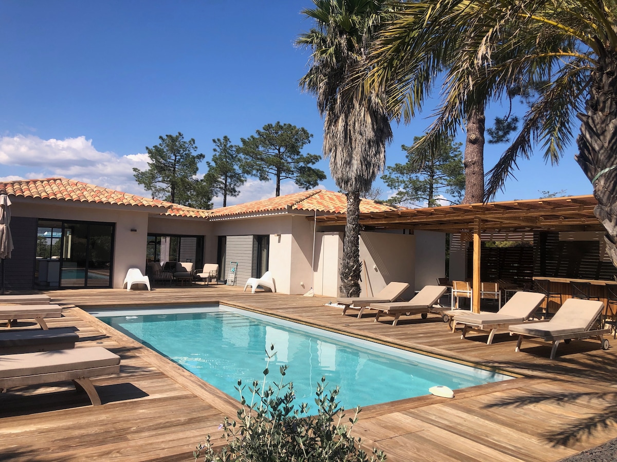 Βίλα σε ένα επίπεδο210τ.μ. κλιματιζόμενη. Μεγάλη ασφαλής και θερμαινόμενη πισίνα με πισίνα στην παραλία. Νέα φωτεινή βίλα, πολυτελείς παροχές σε ένα ιδιωτικό και ήσυχο κτήμα, τεράστιο σαλόνι 100 τ.μ. 4 σουίτες όλες κλιματιζόμενες με το μπάνιο τους να έχουν όλη την ιδιωτική βεράντα τους, συμπεριλαμβανομένων 2 με θέα στην πισίνα. Μεγάλη βεράντα με χώρο ανάπαυσης σε μια κλειστή και δασώδη έκταση. Βίλα εξοπλισμένη με WiFi και δορυφορική τηλεόραση. Ενοικιάσεις από Σάββατο έως Σάββατο!
