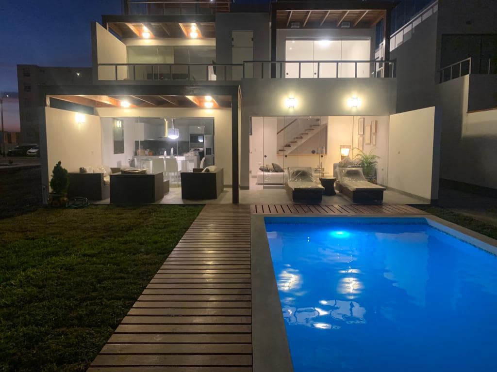 Casa completa de 1200 m2. Una linda casa acogedora con una arquitectura moderna, techos altos y grandes ventanales, ofrece un ambiente luminoso y acogedor, brinda comodidades para realizar actividades con la familia o amigos. Piscina in house, zona de barbacoa, terraza con una hermosa vista a la zona residencial y reserva de paracas, sala de entretenimiento para el disfrute de los niños. Se encuentra en un exclusivo condominio en la bahia de paracas.