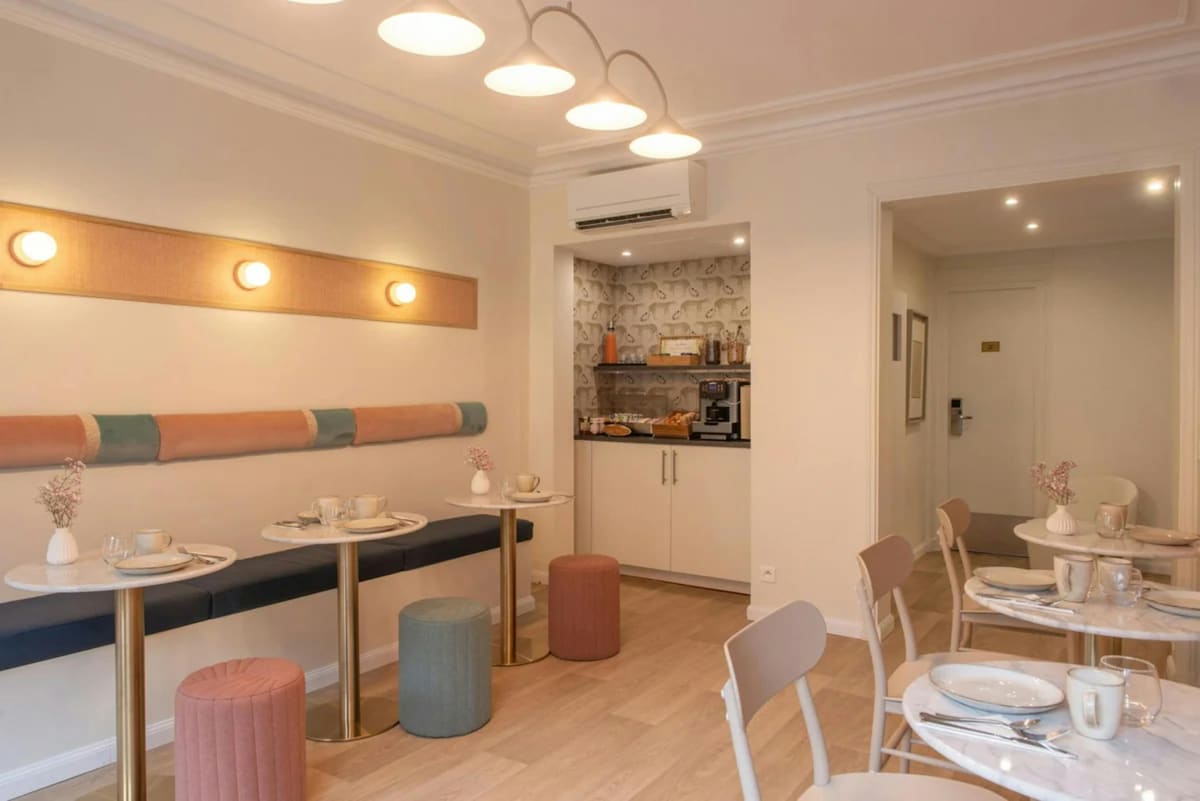The Parisette Classic - Double room offers Parisian chic in a snug, contemporary-style retreat, featuring 10 to 13m² of comfort with twin beds (2x90cm) or a queen-size bed (160cm), an Italian-style shower, and thoughtful amenities like a separate hairdryer, Omnisens well-being toiletries, broadband Wi-Fi, a personal safe for a 15” computer, individual air conditioning, and an 82cm flat-screen TV with international channels.