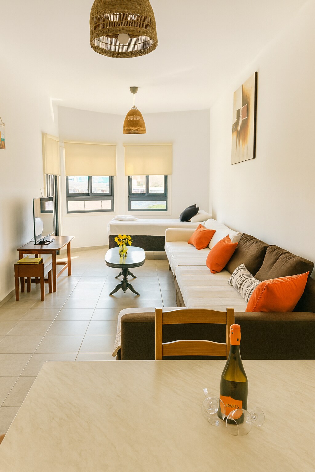 Step into this beautifully designed 2-bedroom apartment, just a 5-minute walk from the famous Nissi Beach. Set in a peaceful area, the resort offers a large shared swimming pool and a separate kids’ pool. Inside, the stylish rope details and warm natural décor create a unique, relaxing atmosphere. The apartment is fully equipped with a coffee machine, washing machine, oven, fast Wi-Fi, and more. Each bedroom has its own TV, plus an extra TV in the living room for total comfort.