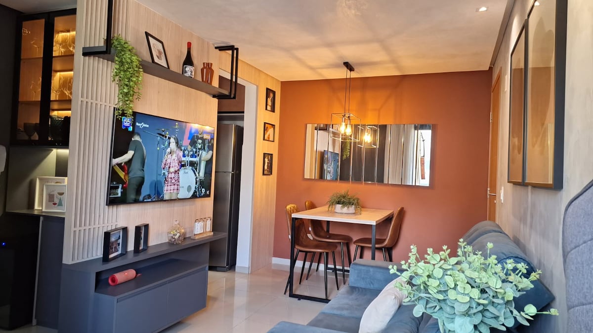 Apartamento aconchegante, completo e pensado nos mínimos detalhes para proporcionar conforto e bem-estar aos hóspedes. Planejado originalmente para moradia, cada espaço reflete cuidado, funcionalidade e charme. Cozinha totalmente equipada e funcional. Sala confortável com TV, Netflix e internet de qualidade. Quarto casal com ar-condicionado e TV 32”. Quarto de visitas com cama box de solteiro com auxiliar, guarda-roupa e ventilador.