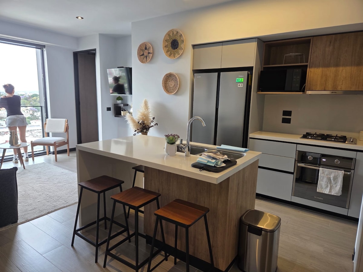 Πολυτελές διαμέρισμα στη Γκουανταλαχάρα, διακοσμημένο από το γραφείο FNisino και με έπιπλα φτιαγμένα κατά παραγγελία από ντόπιους τεχνίτες. Μείνετε σε ένα από τα πιο αποκλειστικά και νέα κτίρια στην Providencia, κοντά στην οικονομική ζώνη, το δάσος Colomos, το Punto Sao Paulo και μόλις 10 λεπτά από το Andares. Εξαιρετικά άνετος χώρος, ο οποίος διαθέτει όλες τις παροχές και θα σας κάνει να έχετε μια απίστευτη διαμονή. Διαθέτει ασφάλεια 24 ώρες το 24-ωρο, πισίνα, γυμναστήριο, συνεργατικό χώρο και δικό του πάρκινγκ.