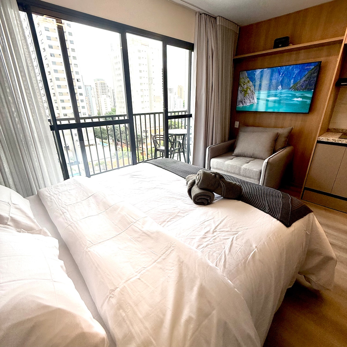 Modern and well-equipped studio in a new building with a gym, gourmet area, laundry room, mini market, and rooftop. Ideal for short or long stays, with fast Wi-Fi, Smart TV, air conditioning, a fully equipped kitchen (air fryer, coffee maker, microwave), and a comfortable home-office space. Includes full bedding and towels. Just 10 minutes from Allianz Parque and Barra Funda Station, near the Memorial and great cultural spots.