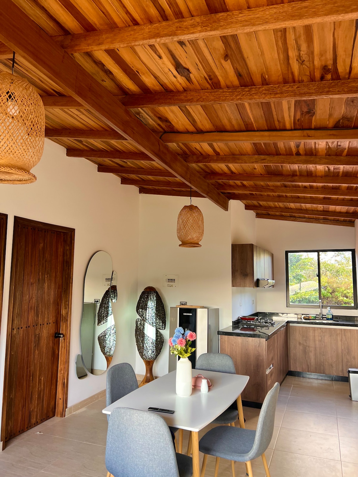 Amanecer con vista espectacular, café y aves cantando todo el tiempo. A pocos minutos de los lugares más turísticos de Boyacá, es un lugar con todas las comodidades sin desconectarse de la tecnología y del trabajo, Jacuzzi volado con vista y un sauna amplio. Puedes encontrar hasta un Viñedo a cinco minutos y los demás planes turísticos como para salir durante el día y volver a relajarse en esta minihouse. Reserva pronto ya que es muy solicitada.