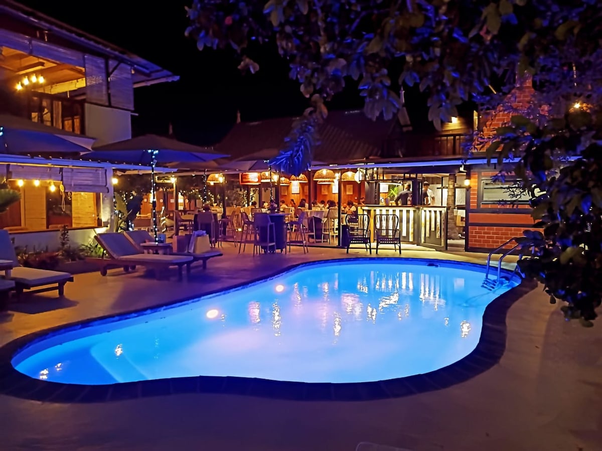Relax in cozy 1-bedroom apartment with private bathroom, shared magnesium pool and serene vintage look terrace with a saloon bar door style! Delight in an unforgettable culinary journey, where Chef Lou prepares refined, exclusive dishes using fresh, local ingredients, a signature experience of your stay. To enjoy this unique dining, simply check with the chef upon arrival. 3 mins walk to the beach and short walks to shops,bakery and pharmacy .An ideal setting for a relaxing and memorable holiday
