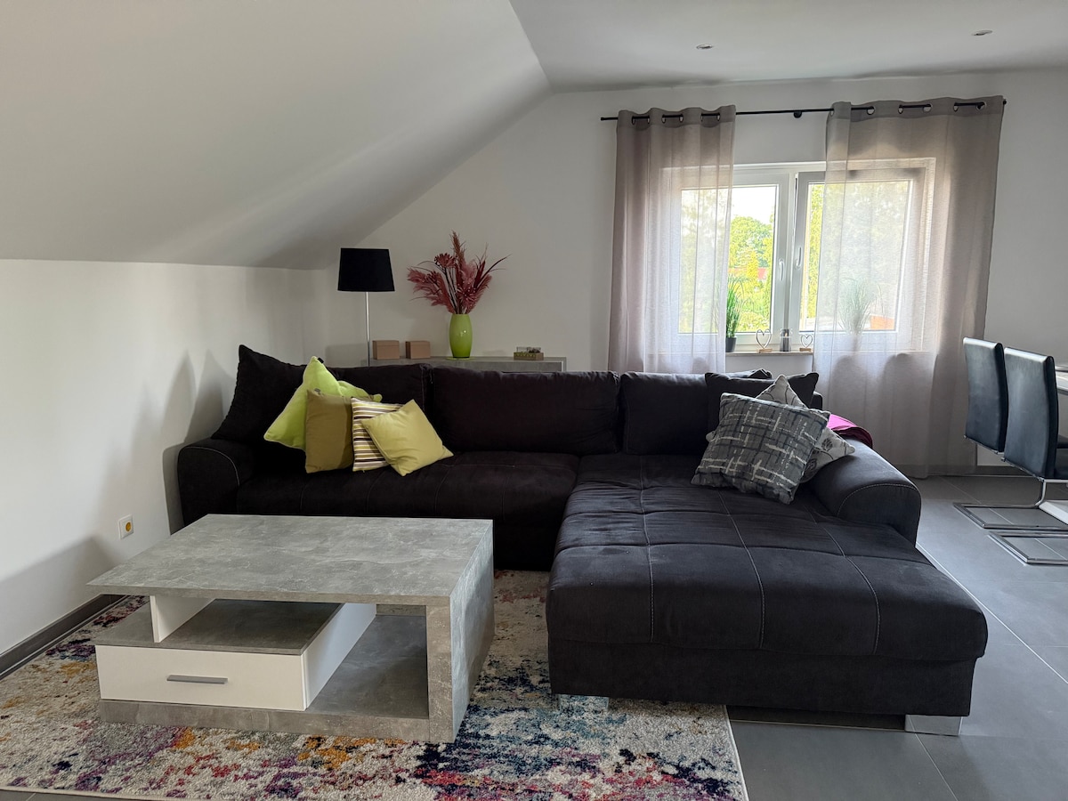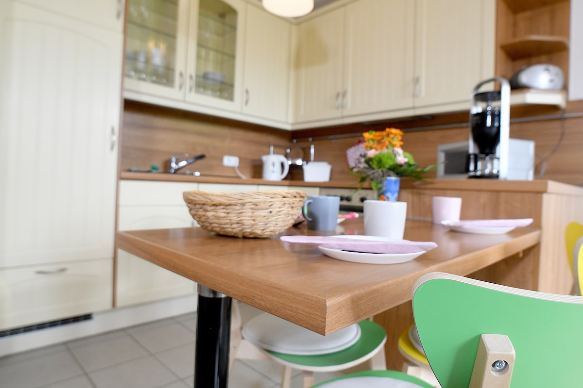 μεγάλο, πλήρως εξοπλισμένο διαμέρισμα (95 τ.μ.) για 3 - 4 άτομα ανάμεσα σε χωράφια, δάση και λιβάδια. Μαζί μας μπορείτε να χαλαρώσετε σε μια ήρεμη ατμόσφαιρα μακριά από την καθημερινή φασαρία. Αλλά και η ψυχαγωγία και ο πολιτισμός δεν πρέπει να παραμεληθούν. Οι κοντινές πόλεις της περιοχής προσφέρουν πολλές δυνατότητες.