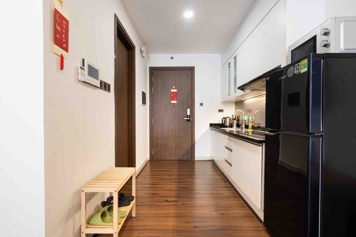 Αυτός ο μοναδικός χώρος έχει σχεδιαστεί για μια εμπειρία πολυτέλειας με στιλ. Με μια έξυπνη συρόμενη πόρτα, το σαλόνι και το υπνοδωμάτιό σας συνδέονται εύκολα για να μεγιστοποιήσετε το ευρύχωρο σπίτι των 50 τ.μ. Περπατώντας στη γέφυρα BaSon μεταξύ του διαμερίσματος και του D1, μπορείτε να νιώσετε το αεράκι του ποταμού Σαϊγκόν και την εκπληκτική θέα της πόλης. Με μόλις 5 έως 10 λεπτά με ταξί, μπορείτε να φτάσετε στο κέντρο της πόλης.