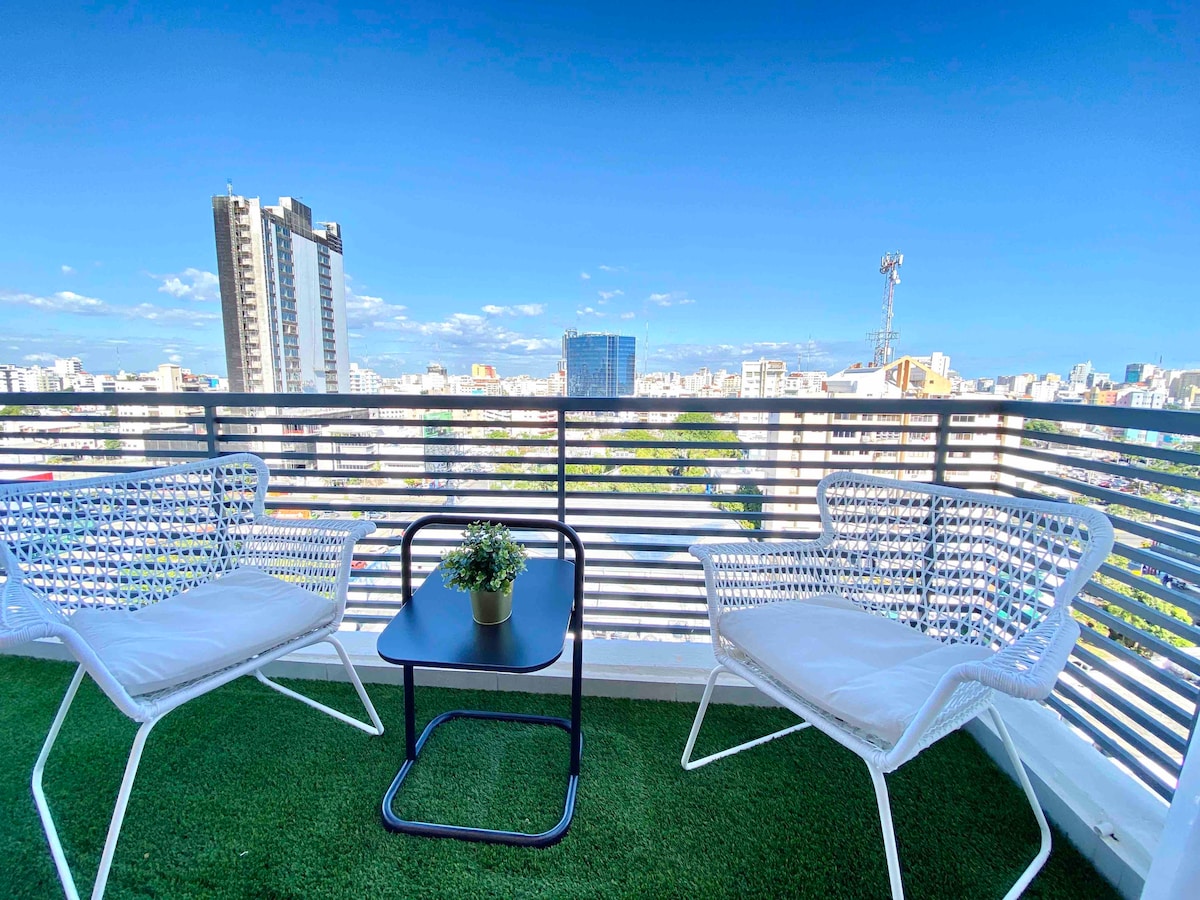 Όμορφο και μοντέρνο διαμέρισμα που βρίσκεται στο κέντρο της πόλης του Σάντο Ντομίνγκο, πλήρως εξοπλισμένο και επιπλωμένο, κλιματιστικό, Smart TV συν 200 κανάλια, εξαιρετικά γρήγορο Wi-Fi, ιδιωτικό καλυμμένο χώρο στάθμευσης, κοινόχρηστος χώρος με γυμναστήριο, βεράντα με καρέκλες και μπάρμπεκιου, όμορφη θέα και όλα όσα χρειάζεστε στην πόλη μόλις ένα βήμα μακριά από εσάς. Νιώστε σαν στο σπίτι σας σε αυτό το γοητευτικό και άνετο διαμέρισμα. Είναι ιδανικό για χαλαρωτικά ταξίδια ή για επαγγελματικά ταξίδια.