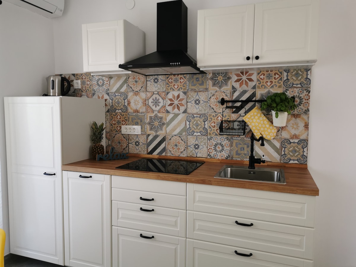 The house is situated in a calm zone, not far from the beautiful beaches and a little port. It has a big garden where the guests can rest, grill, and the children play. A swimming pool is in front. It is a new furnished and renovated (2020.) comfortable apartment, on the first floor. Ideal for 6 people. It has two big bedrooms, a living room with sofa-bed, kitchen, bathroom, a balcony and terace. It has see view and is air-conditioned. The house has free private parking and wi-fi.