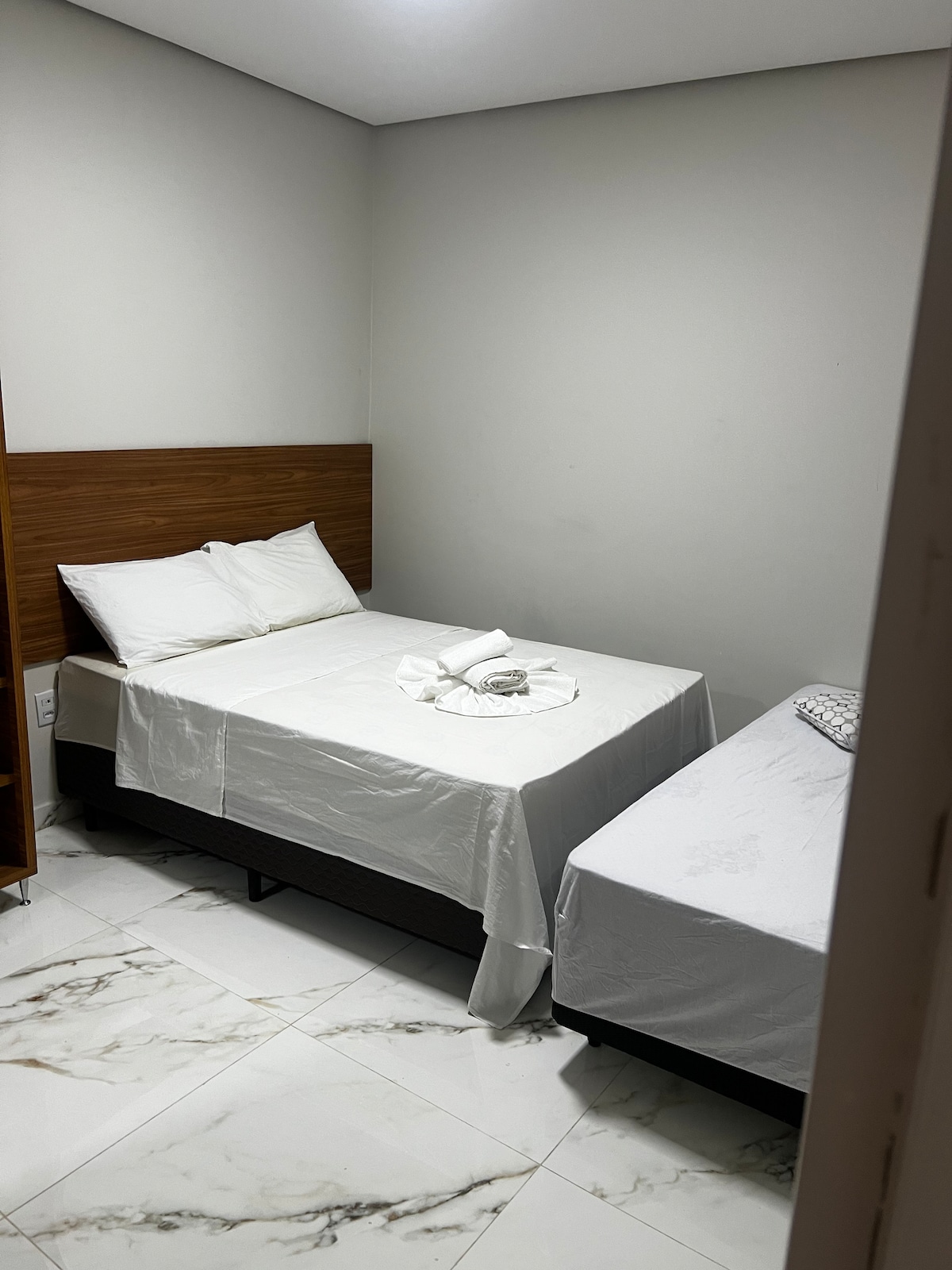 Relaxe nesta acomodação tranquila e aconchegante, flat contém ar-condicionado, Cooktop, geladeira microondas, camas de casal e solteiro, mesa para refeições, escrivaninha, etc…