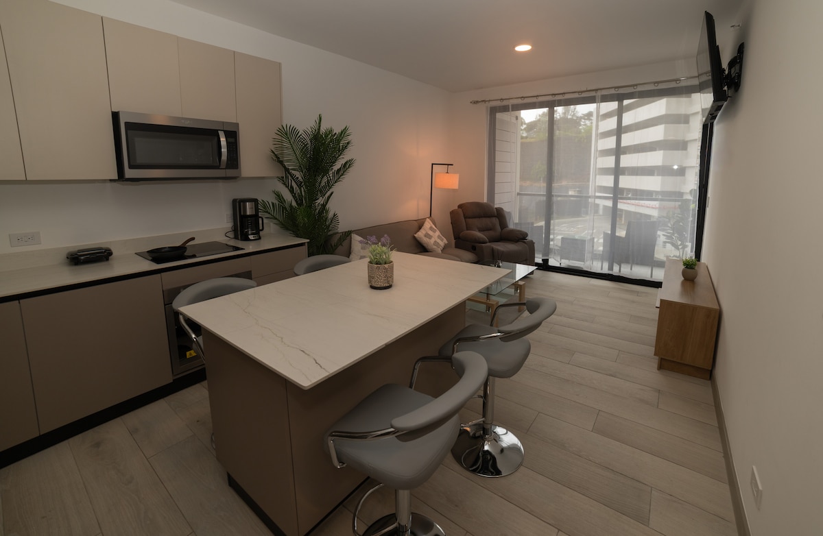 Πολυτελές διαμέρισμα με κλιματισμό, άνετο και σε ιδανική τοποθεσία στην καρδιά της πόλης. Αυτός ο πλήρως εξοπλισμένος χώρος, με μοντέρνα και κομψή διακόσμηση, σας προσφέρει την ελευθερία να ζήσετε με ασφάλεια και άνεση, ενώ εξερευνάτε όλα όσα έχει να προσφέρει η πόλη. Κοντά σε τουριστικά αξιοθέατα, τράπεζες, σούπερ μάρκετ και εστιατόρια. (Το διαμέρισμα διαθέτει 8 εστιατόρια εντός των εγκαταστάσεων) Το Διεθνές Αεροδρόμιο (SJO) απέχει 20 λεπτά, το πάρκο La Sabana και το νέο Εθνικό Στάδιο είναι 3 λεπτά μακριά στο Σαν Χοσέ.