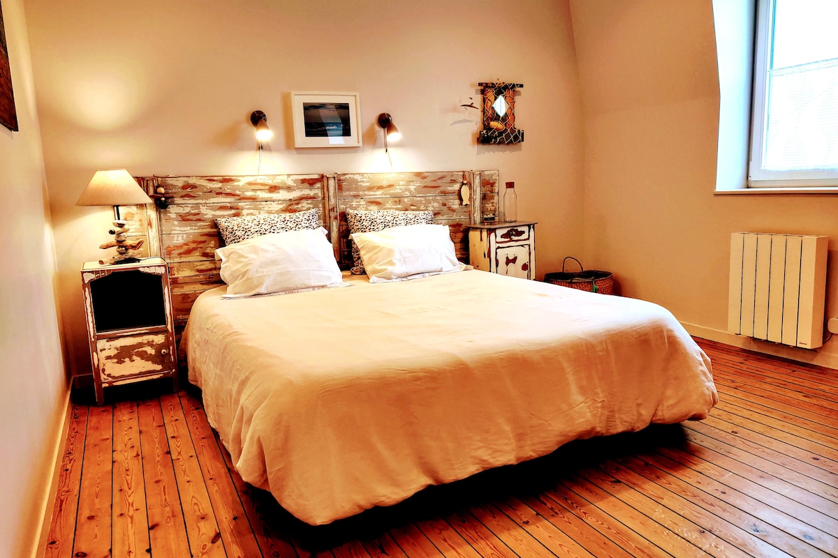 Διαμέρισμα 32 τ.μ. στον 1ο όροφο ενός όμορφου, χαρακτηριστικού σπιτιού στη συνοικία Cordiers, που βρίσκεται 50 μέτρα από την παραλία, τα καταστήματα και το τελεφερίκ των βράχων. Ανακαινισμένο κατάλυμα, εξοπλισμένο και διακοσμημένο με γούστο. Αποτελείται από ένα ζεστό υπνοδωμάτιο με ένα διπλό κρεβάτι, ένα σαλόνι με εξοπλισμένη κουζίνα (φούρνος μικροκυμάτων, ηλεκτρικός φούρνος, ηλεκτρική εστία, καφετιέρα Senseo), τραπεζαρία, καναπέ, τηλεόραση και μπάνιο με ντους. Παρέχονται δωρεάν σεντόνια και πετσέτες Βρεφική κούνια κατόπιν αιτήματος Η περιοχή Cordiers, εμβληματική για τα ψαροκάλυβάκια της, βρίσκεται ιδανικά στην καρδιά της τουριστικής πόλης Tréport. Όλα είναι διαθέσιμα σε απόσταση 50 μέτρων: - Τοπικά καταστήματα (φούρνος, μίνι μάρκετ, φαρμακείο, πρακτορείο εφημερίδων, εστιατόρια...) - Αναψυχή και τουρισμός (τελεφερίκ για τους βράχους, παραλία, καζίνο JOA, λιμάνι, πάρκο παιχνιδιών και γυμναστήριο ...) Τοπική αγορά κάθε Τρίτη και Σάββατο Σιδηροδρομικός σταθμός SNCF Le Tréport περίπου 15 λεπτά με τα πόδια (διατίθενται τακτικά λεωφορεία) Δεν χρειάζεται να έχετε όχημα για να απολαύσετε τη διαμονή σας. Το διαμέρισμα βρίσκεται επίσης σε ιδανική τοποθεσία για βόλτες, με τα πόδια ή με ποδήλατο. Θα βρείτε τον κόλπο Somme σε απόσταση 30 χιλιομέτρων με τις φώκιες του και την πόλη St-Valery-sur-Somme. Είμαι πάντα διαθέσιμος να σας συμβουλεύσω για τις εξόδους, την αναψυχή, τα αξιοθέατα, τα μπαρ και τα εστιατόρια. Θα θέλαμε να κάνουμε ό,τι μπορούμε για να σας κάνουμε να θέλετε να επιστρέψετε! Ευέλικτες ώρες άφιξης/αναχώρησης ανάλογα με τη διαθεσιμότητα