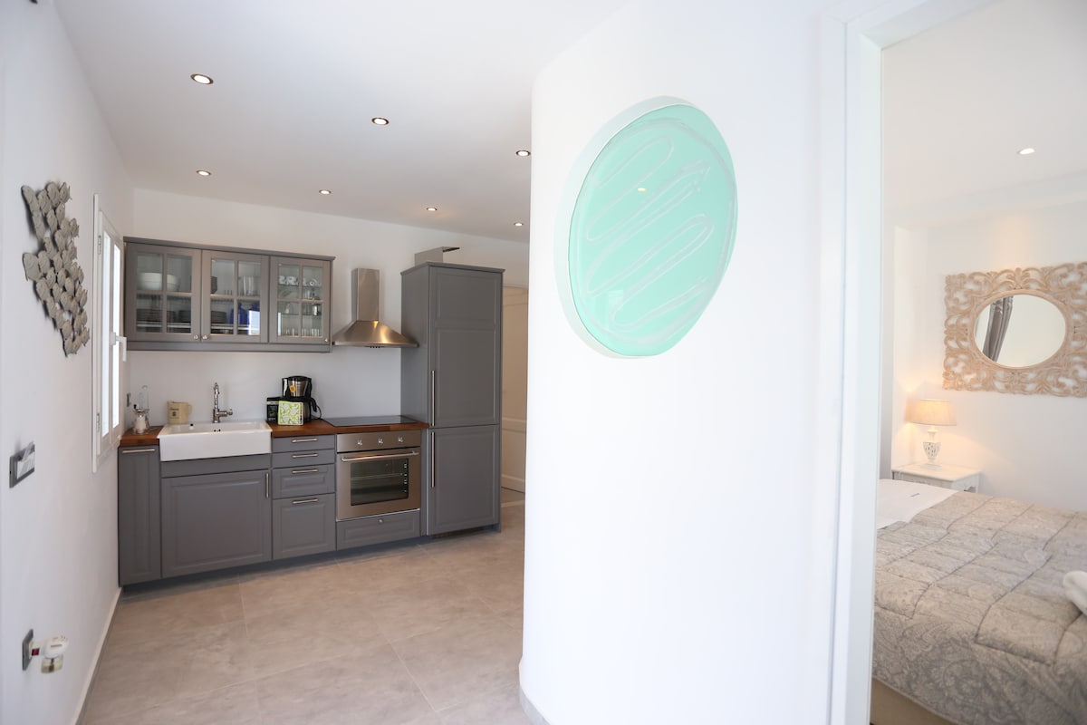 Modern minimal design studio,shiny,comfortable and fully equipped.Private entrance and balcony with sea view.Chic and relaxing ambient.Few minutes on foot from the most cosmopolitan beach of the island "Psarou beach" and "Platys Yialos".Only 3 Km from Mykonos Town and very close to the bus station(URL HIDDEN) Facilities: A/C,T.V.,private bathroom,washing machine,linen,fully equipped kitchen,espresso machine.