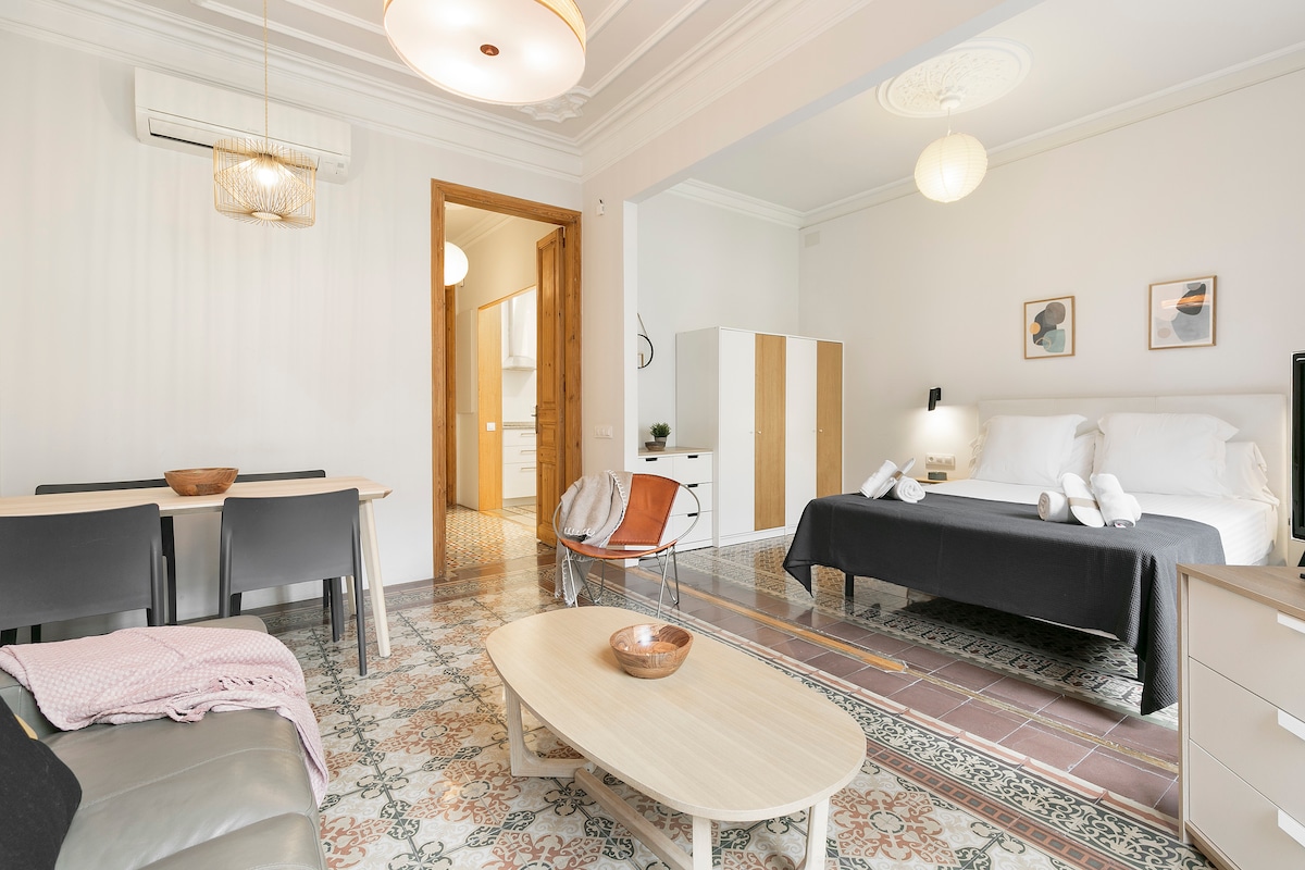 Το σπίτι σας με βεράντα, μόλις 8 λεπτά από την παραλία. Χαλαρώστε σε αυτό το άνετο διαμέρισμα που έχει σχεδιαστεί για να νιώθετε σαν στο σπίτι σας. Απολαύστε μια ιδιωτική βεράντα, ιδανική για ηλιόλουστα πρωινά ή δείπνο κάτω από τα αστέρια. Η παραλία είναι μόλις λίγα βήματα μακριά, πλήρως εξοπλισμένη κουζίνα, γρήγορο WiFi και ευέλικτη άφιξη. Ιδανική τοποθεσία κοντά σε εστιατόρια, καταστήματα και μέσα μεταφοράς. Παρέχονται πετσέτες και κλινοσκεπάσματα. Βοήθεια 24 ώρες το 24ωρο. Θα μοιραστώ μαζί σας τοπικές συμβουλές, ώστε να επωφεληθείτε όσο το δυνατόν περισσότερο από τη διαμονή σας. Ζήστε τη Βαρκελώνη σαν στο σπίτι σας!