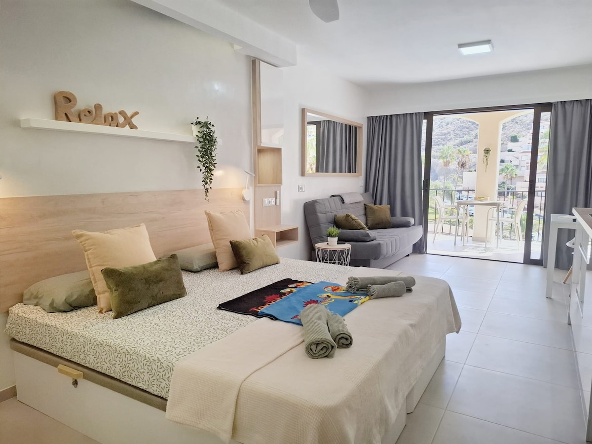 Cozy and confortable studio located at few metres from the beach and markets. Very quiet and equipped with everything. The residence has a big swimming pool and a relaxing area where you can enjoy your holiday. Shops and restaurants are in a walking distance, and if you are finding the night life in less then 5 minutes there are a lot of clubs in Las Veronicas. The bus station is at 1 minute from the studio, so you can reach every destination in the island even without a car.