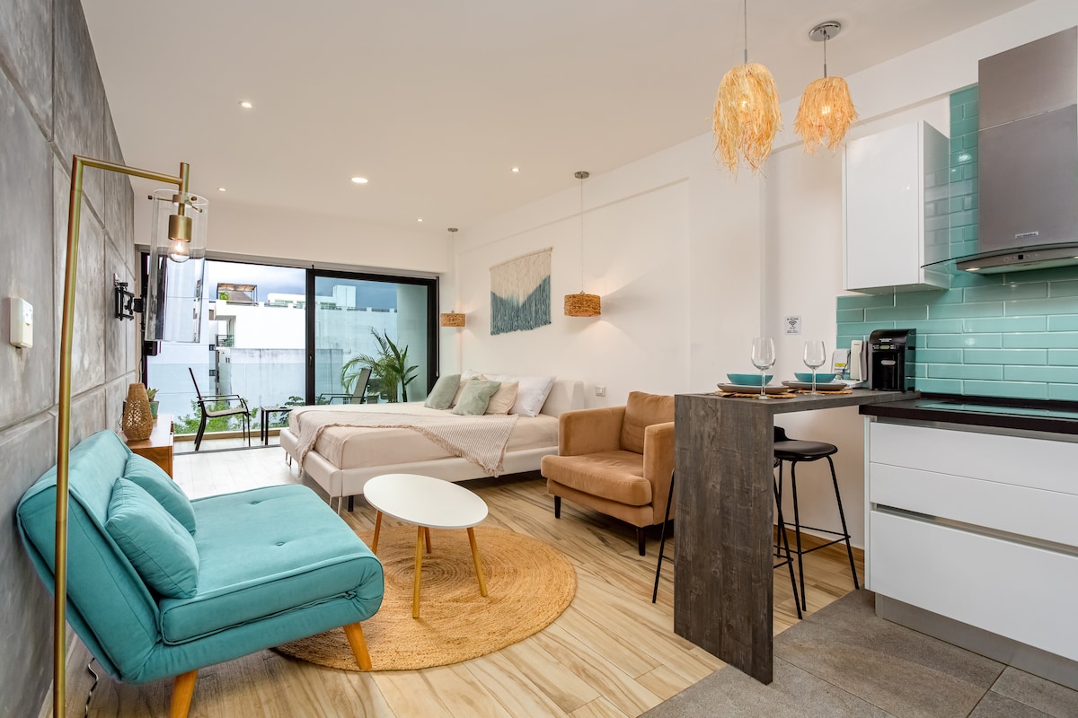 Ξεκουραστείτε σε ένα υπέρδιπλο κρεβάτι σε ένα κομψό και φωτεινό στούντιο που συνδυάζει άνεση και στυλ. Βρίσκεται στην 5η Λεωφόρο με την 52η Οδό, στο πιο ήσυχο, μοντέρνο και όμορφο μέρος της Πλάγια ντελ Κάρμεν, με καφετέριες, εστιατόρια, μπουτίκ και την παραλία σε απόσταση λίγων λεπτών. Απολαύστε γρήγορο WiFi, Smart TV, εξοπλισμένη κουζίνα και μπάνιο με ντους οροφής. Ένα μπουτίκ καταφύγιο στην καρδιά της Καραϊβικής για εκλεπτυσμένους ταξιδιώτες. Κάντε κράτηση τώρα!