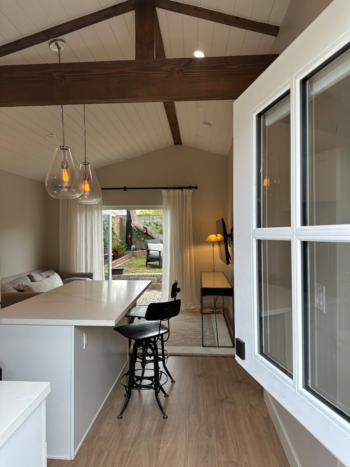 A restful hideaway. safe, charming, 1 newly renovated 1 bedroom Guest House in the residential, Kentwood area of Westchester. Simple street parking. Walking distance to LMU, Supermarkets, and neighborhood amenities. 10-minute drive to LAX, Playa Del Rey Beach, and SOFI. Drive north on coast to MDR, Venice, Malibu. Open plan Living/Kitchen with all amenities. The living space opens onto private outdoor sitting area. Outdoor view from bedrm. Shared eating area for 6/ barbecue.
