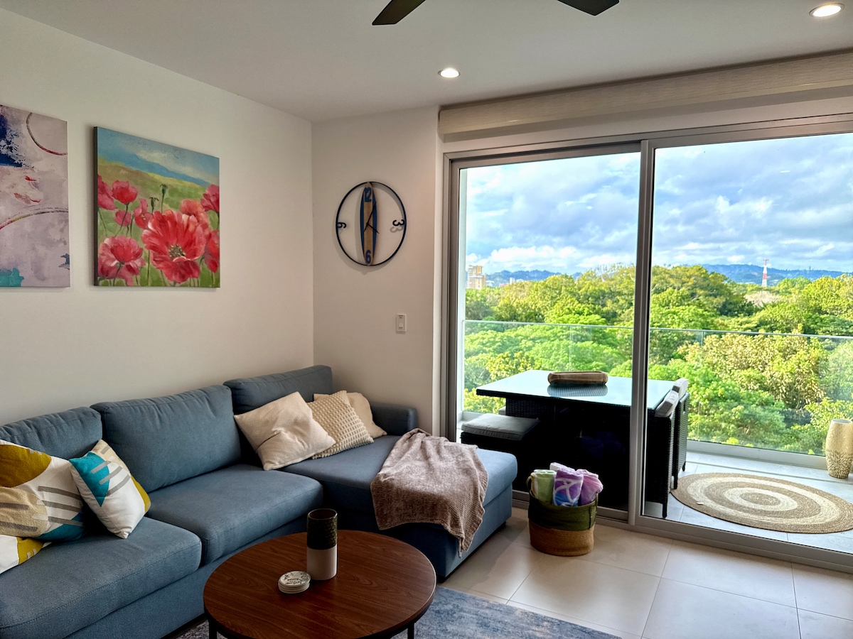 2 κρεβάτια, 2 μπάνια, οικολογικό πολυτελές διαμέρισμα με πανοραμική θέα στην κορυφή του δέντρου. Με ηρεμία και θέα σε ένα φυσικό καταφύγιο όπου μπορείτε να παρακολουθήσετε κόκκινους παπαγάλους Macaw και ένα τετράγωνο μακριά από την παραλία σε μια περιφραγμένη κοινότητα με εκπληκτική πισίνα σε στιλ θέρετρου. Πρόσφατα ανακαινισμένο από τοπικό διακοσμητή εσωτερικών χώρων, με όλες τις ανέσεις, όπως νέες συσκευές, έξυπνες τηλεοράσεις, στρώματα ξενοδοχείου και τα καλύτερα φωτιστικά και φινιρίσματα. Λίγα βήματα από καταστήματα, εστιατόρια και ιδανικό για ημερήσιες εκδρομές σε καταρράκτες, μονοπάτια ζούγκλας και παραλίες.