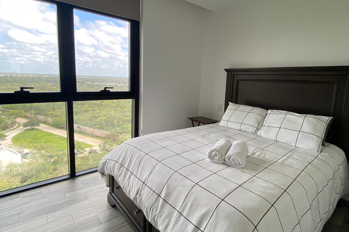 Loft για ενοικίαση διακοπών, που βρίσκεται στον 17ο όροφο, Adamat Mérida, διαμορφωμένο για να απολαύσετε τη θέα του από οποιαδήποτε γωνία, είτε είναι η τραπεζαρία, το σαλόνι ή το υπνοδωμάτιο, μέσα στο οικιστικό συγκρότημα Cabo Norte όπου θα βρείτε το πιο σημαντικό εμπορικό κέντρο της πόλης, Plaza La Isla, μόλις 2 λεπτά με τα πόδια, καθώς και μονοπάτια για περπάτημα, πισίνα, γυμναστήριο, αίθουσα γιόγκα, αίθουσα παιχνιδιών, Sky Lounge, Roof garden και πλυντήριο