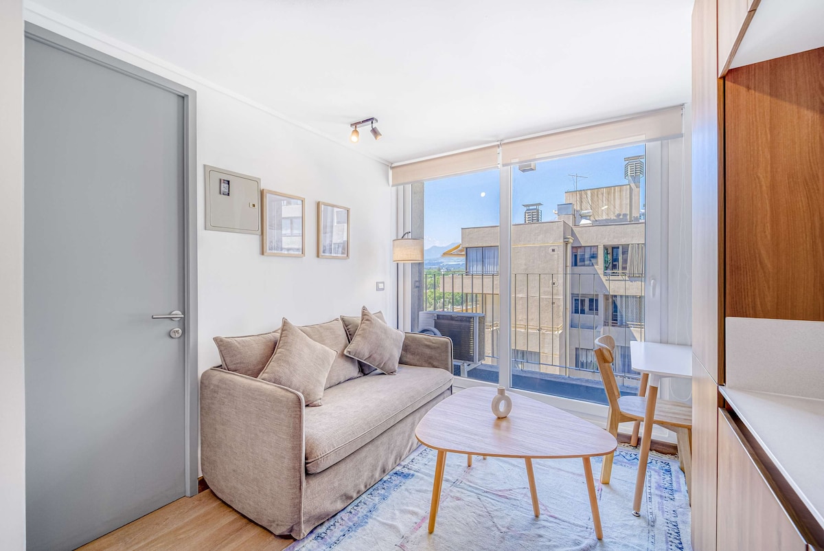 With Air conditioning! Cozy apartment on the 16th floor with stunning mountain views. The suite is equipped with thermal windows to keep you comfortable and has all the comforts of home, making it perfect for your stay. For getting around, it's ideally located: 300 meters from the subway station 110 meters from Plaza Ñuñoa, the heart of the district. This puts you close to public transportation and allows you to easily explore the area's shops, restaurants, and cultural offerings.