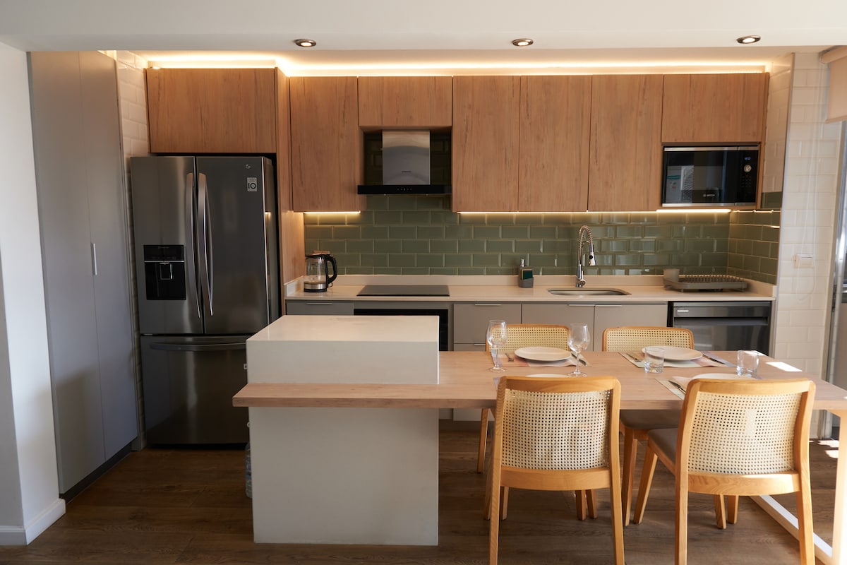 Enjoy our modern, quiet and centrally located north-facing accommodation, very well connected to a metro station, supermarket, banks and commerce in general, close to the bohemia of Plaza Ñuñoa, the National Stadium and restaurants with all the vibes of the neighborhood . If you like cooking, this is your place. We have thought of a kitchen integrated into the spaces with comfortable and modern equipment. Includes underground parking in the building.