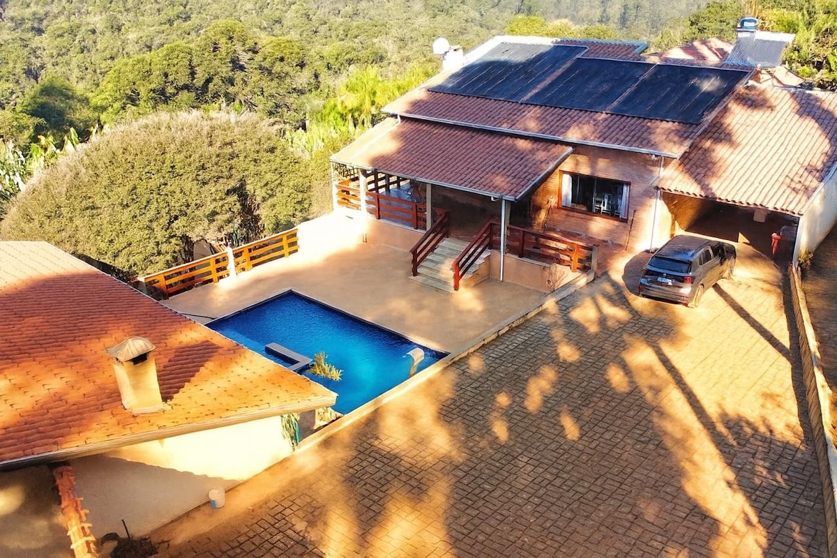 PRICES ARE FOR ACCOMMODATION ONLY. CONTACT US FOR EVENTS (OVER 20 PEOPLE). There are over 200,000 m2 of space with a pond, the Dona Flor Fountain, a basketball court, a soccer field, a slide, seesaws, a sand pool, a grass sled track, trails to the top of the mountain with viewpoints, as well as a party room with another kitchen, barbecue area and wood-fired pizza oven. The house can accommodate up to 8 people. We are right on the edge of the ancient volcano. Search for our posts on media
