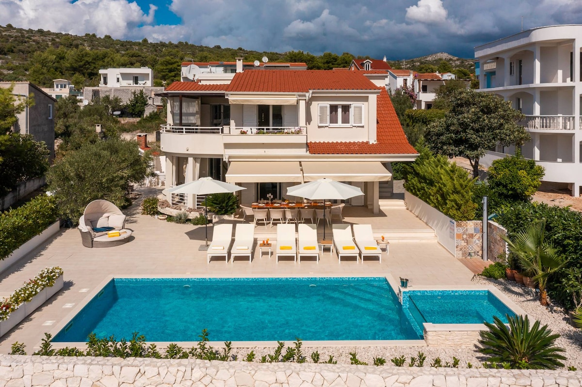 (ΚΑΝΤΕ ΚΛΙΚ ΣΤΗΝ ΑΦΙΞΗ ΤΟ ΣΑΒΒΑΤΟ - 7 Ή 14 ΗΜΕΡΕΣ) **ΕΠΙΚΟΙΝΩΝΗΣΤΕ ΜΑΖΙ ΜΑΣ ΓΙΑ ΑΛΛΕΣ ΗΜΕΡΟΜΗΝΊΕΣ** Απολαύστε την πολυτέλεια και την ιδιωτικότητα στην όμορφη παραθαλάσσια βίλα μας με θερμαινόμενη πισίνα, τζακούζι, βεράντες, χώρο ψησταριάς και υδρομασάζ στη βεράντα του τελευταίου ορόφου. Ιδανικό για οικογένειες ή παρέες που αναζητούν άνεση στη Δαλματία. Μοντέρνα μπάνια και υπνοδωμάτια με εκπληκτική θέα στη θάλασσα. Χώρος στάθμευσης για 4 αυτοκίνητα, 25 λεπτά από το αεροδρόμιο του Σπλιτ. Κάντε κράτηση τώρα!
