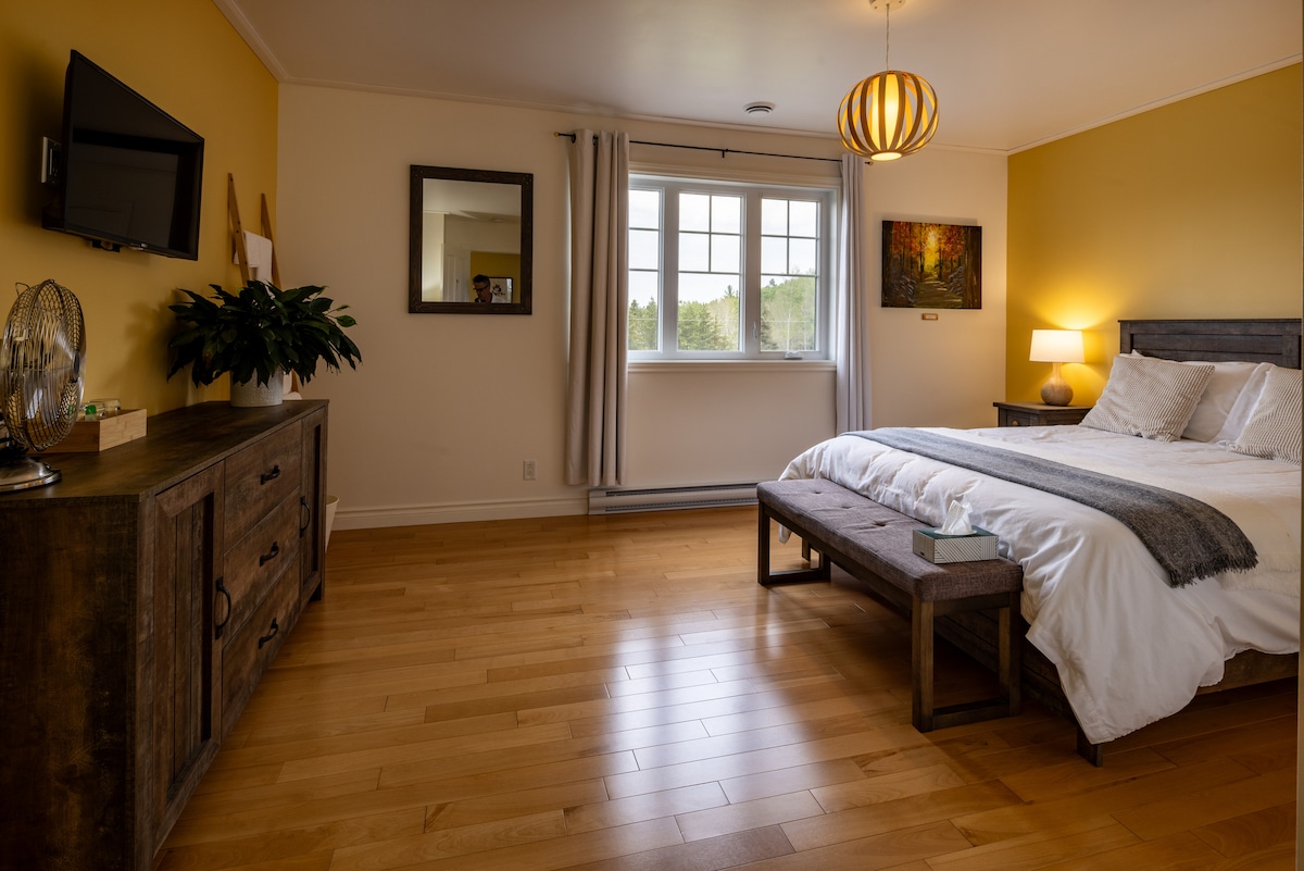 Niché sur les hauteurs du Ruisseau‑Jureux, le chalet Le Pin Perché domine le paysage et offre une vue spectaculaire sur le fleuve Saint‑Laurent et les montagnes. Chaque lever de soleil sur la terrasse est un moment magique, une invitation à commencer la journée en douceur !