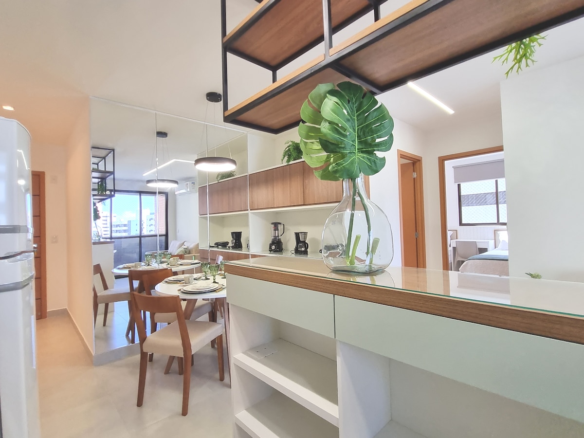 Άνετο, μοντέρνο διαμέρισμα, 30 τ.μ., με υπέροχη θέα στη θάλασσα της Pajuçara (πλαϊνή θέα - μπαλκόνι), σχεδιασμένο, εξοπλισμένο με ψυγείο, φούρνο μικροκυμάτων, ηλεκτρικό φούρνο, εστία μαγειρέματος, μπλέντερ, ψησταριά, καφετιέρα Tres Corações, μαχαιροπίρουνα και βασικά μαγειρικά σκεύη, Smart TV 43", Wi-Fi, κλιματισμό 18000btus, τραπεζαρία με 4 καρέκλες, βοηθητικό τραπέζι και μεγάλη ντουλάπα για ρούχα. Παρέχονται κλινοσκεπάσματα και πετσέτες μπάνιου. Διαθέτει ένα διπλό κρεβάτι και έναν καναπέ-κρεβάτι για 2 άτομα.