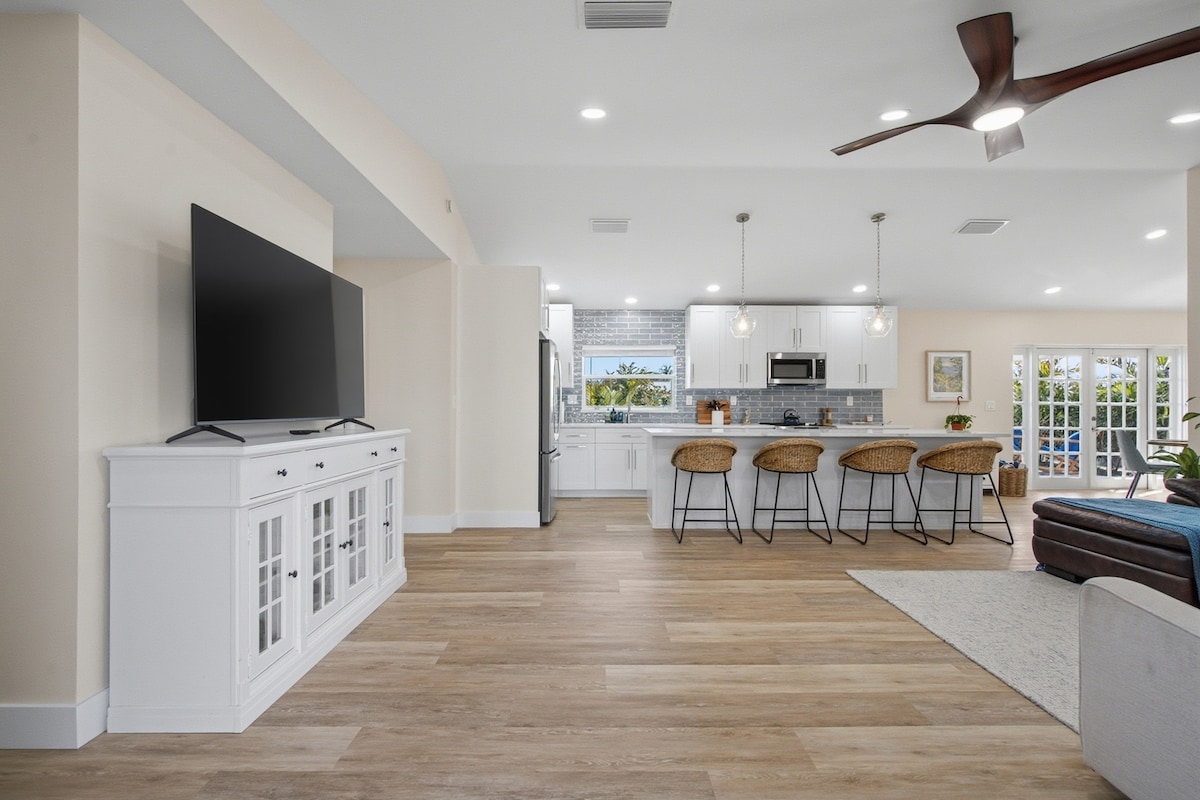 Discover the Hidden Gem at Shady Acres! This beautifully remodeled 3-bedroom escape offers spacious, open-concept living with a bright Florida vibe. The spacious, open kitchen, centered around a large granite island, invites culinary creations and lively gatherings. The primary Flamingo Room features a luxurious, spa-like bathroom. Entertainment abounds with a 55-inch Roku TV in the main living area, and smart TVs in all bedrooms. 1 mile to Port Salerno restaurant district!