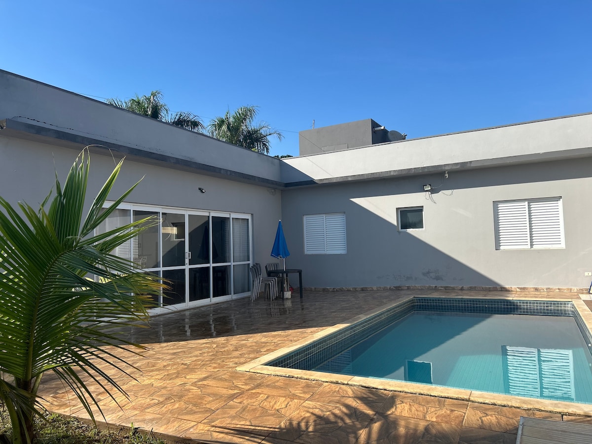 Στο Porto Feliz, χαλαρώστε με όλη την οικογένεια σε ένα ευρύχωρο, ευάερο σπίτι που περιβάλλεται από φύση. Υπάρχουν 3 υπνοδωμάτια (1 ιδιωτικό), μια εξοπλισμένη κουζίνα, ένα ενσωματωμένο σαλόνι και τραπεζαρία, κλιματισμός και ένα άνετο μπαλκόνι. Ο εξωτερικός χώρος διαθέτει αποκλειστική πισίνα, μπάρμπεκιου, παιδική χαρά και ράμπα για μίνι σκέιτ. Μένουμε σε ένα άλλο σπίτι στην ιδιοκτησία, αλλά το κατάλυμα είναι εντελώς ανεξάρτητο, με εγγυημένη ιδιωτικότητα.