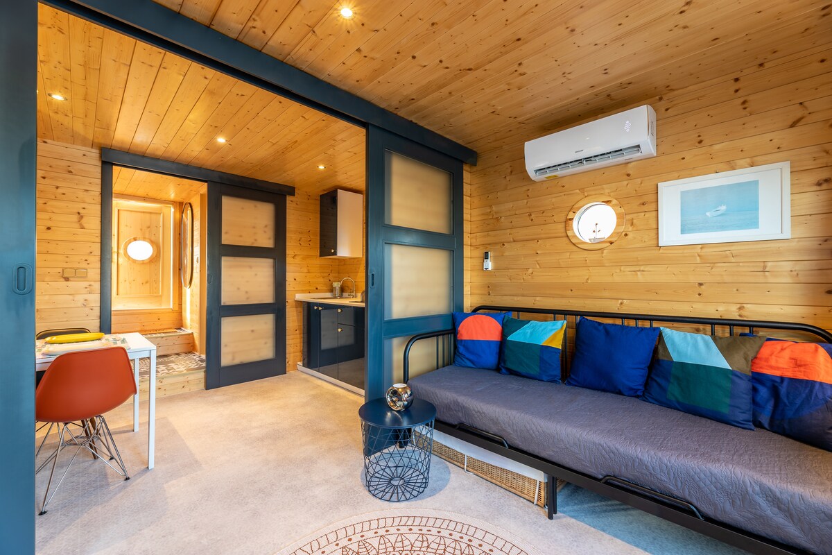 Stay in a unique and comfortable houseboat with two terraces, A/C. Fully HEATED during winter! Ideal for 2-4 people, Ground floor with a bathroom, fully equipped kitchen, and spacious dining area. The living room includes a TV, convertible sofa, wardrobe, desk, and a rocking chair. You can create a separate bedroom with privacy by closing the sliding door between the kitchen and living room. Upstairs, there is a large terrace and bedroom with double bed and storage space.