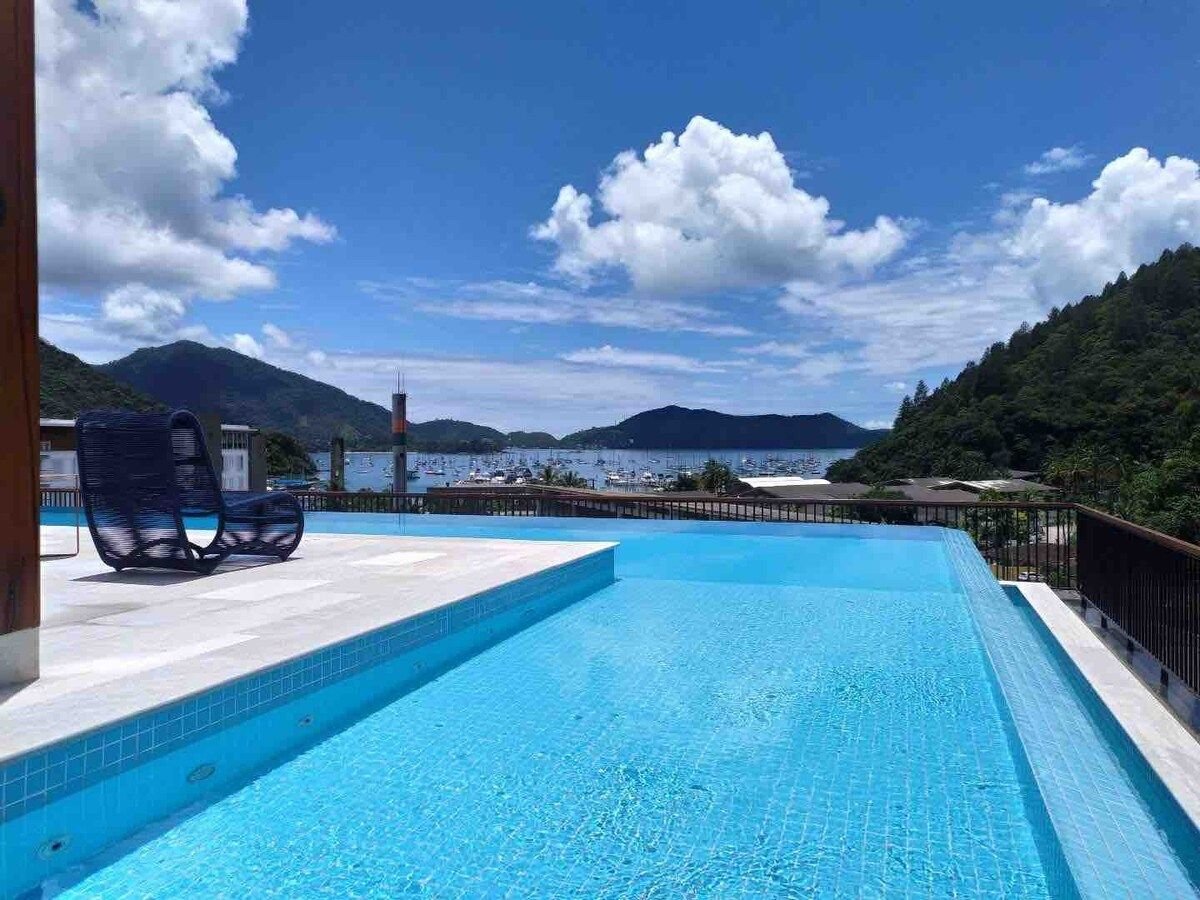 Νέο/ανακαινισμένο διαμέρισμα, με εκπληκτική θέα στη θάλασσα στην καλύτερη τοποθεσία της Ubatuba. Κοντά σε όλα και ταυτόχρονα μέσα στη φύση. 1 υπνοδωμάτιο με ένα διπλό κρεβάτι και θέα στη θάλασσα Ενσωματωμένο δωμάτιο με κουζίνα Πισίνα στο διαμέρισμα. Κλιματιζόμενο Γρήγορο Wi-Fi 200mb Γκαράζ Ρεσεψιόν 24 ώρες το 24-ωρο Βρίσκεται στην Prainha do Matarazzo και 5 λεπτά από την Praia do Perequê-Açu. Μοντέρνο και με θέα στον παράδεισο. Επειδή είμαστε κοντά στο Café de La Musique, ενδέχεται να υπάρχει θόρυβος τα Σαββατοκύριακα.