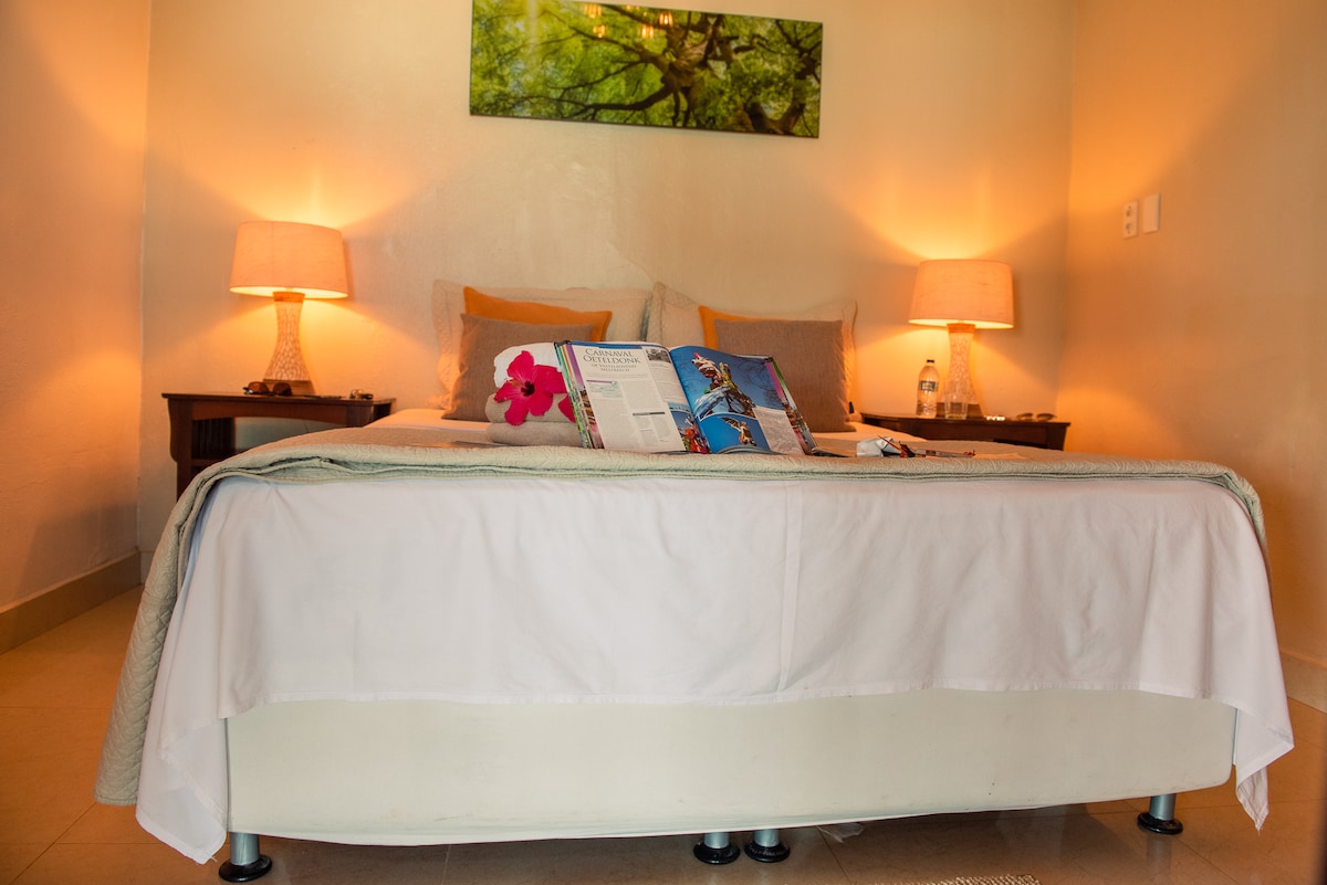 Além de uma ventilação natural extraordinária, o quarto oferece ar condicionado. Também um frigobar e chuveiro elétrico. TV tela plana 21", Netflix e WI-Fi. No quarto encontrarão kit de limpeza caso precisem e trocamos toalhas e lixo sempre que necessário.