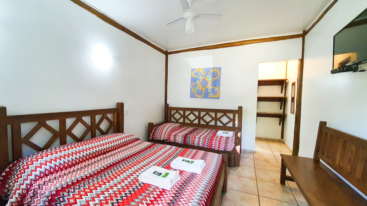 Esta suíte possui uma cama de casal, uma beliche, um banheiro, TV, ventilador de teto e ar condicionado. A suíte também inclui lençol com elástico para o colchão, travesseiros e fronhas.