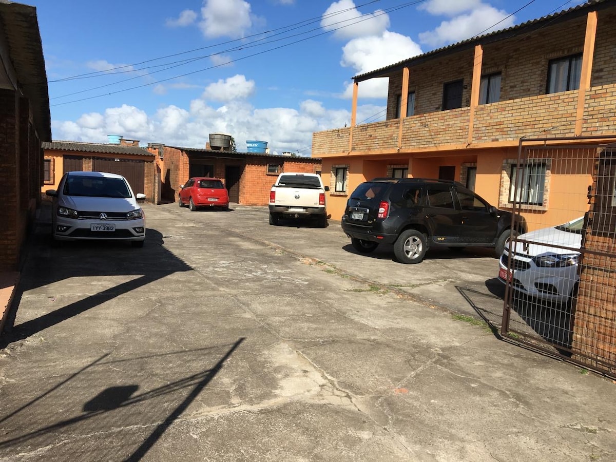 Bem-vindo ao seu espaço de descanso na Praia do Cassino. A acomodação oferece um quarto privativo, sala integrada à cozinha com sofá-cama e um mezanino de pé-direito baixo com três colchonetes. Conta com lavanderia compartilhada e estacionamento em frente ao imóvel, monitorado por câmeras 24h. A região é tranquila, segura e ideal para quem busca conforto e privacidade.
