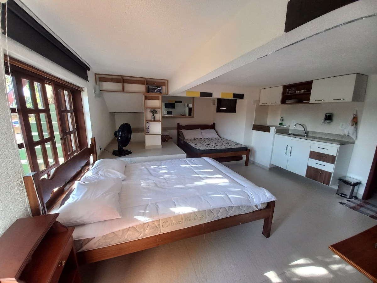 A apenas 200 metros da Rua das Pedras, nossa suíte acomoda até 3 pessoas com conforto e praticidade. Localizada perto de lojas, mercado e farmácias, você terá tudo ao alcance dos seus pés. O espaço é moderno e acolhedor, ideal para relaxar após explorar a cidade! A suíte disponibiliza 1 cama de casal e 1 cama de solteiro, além de roupa de cama e toalha de banho! Além de Ar condicionado, Tv Smart, Internet frigobar, sanduicheira, copos e talheres! Em cima do Boxbiocardio! ( academia)