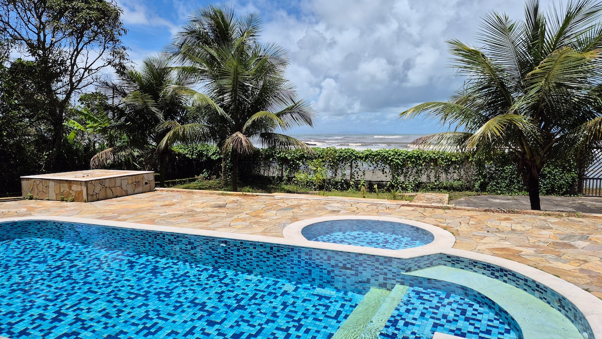 Relaxe neste local privilegiado e tranquilo Uma casa que integra o canto dos pássaros com o som do mar. Venha passar dias maravilhosos nesse paraíso particular. Hospedamos até 10 pessoas Suite master - 1 Cama Queen e 2 de solteiro e varanda com vista espetacular da praia Suite 2 - Cama de casal, 1 solteiro, ar condicionado e 2 ventiladores, com vista incrível para o mar Suite 3 - Cama Queen e ventilador de teto Piscina frente à praia, terraço gourmet, fogão à lenha e churrasqueira