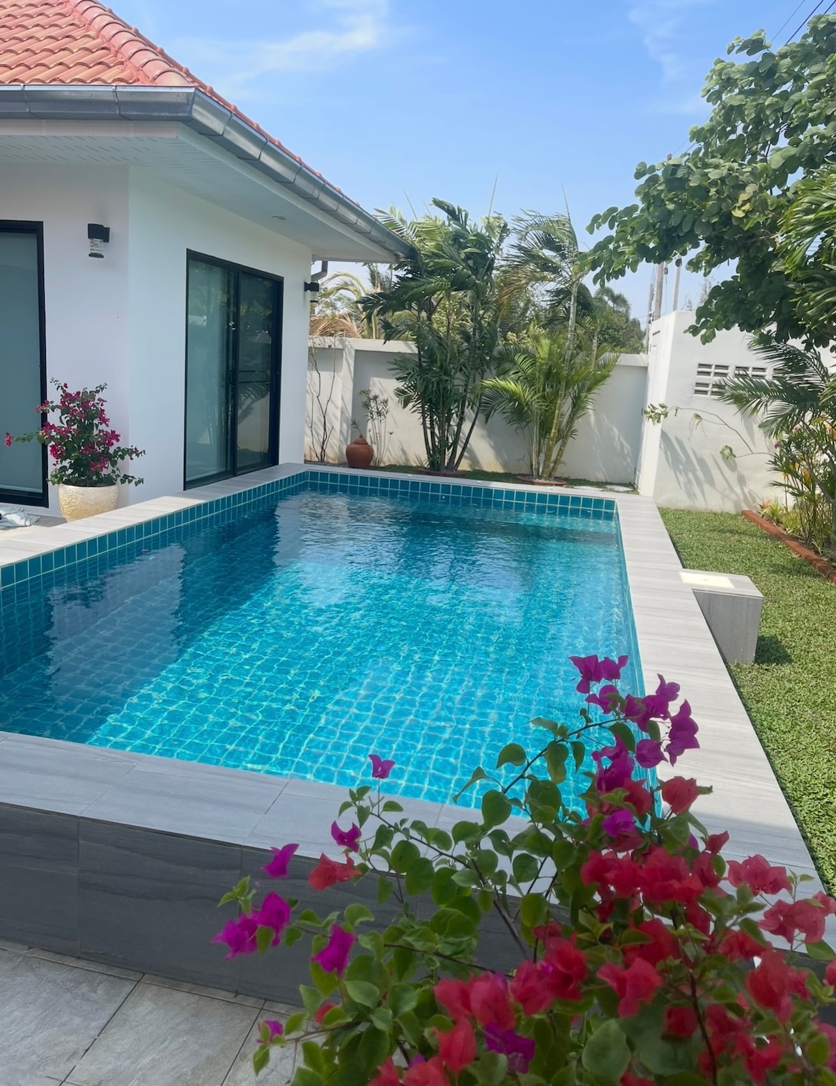 Entire villa suitable for couples, friends or families looking for an easy place to chill by the private pool, sunbathe on the rooftop or relax in the comfortable living area. Full kitchen with oven. The private 8m salt-water pool gets direct sunlight mornings and afternoons. 5min drive to local beach, 15min walk to 7Eleven and local food stalls. Primary bedroom has kingsize bed with en suite. Guest room has twin beds and separate bathroom. Wifi available throughout. Sorry, no pets.