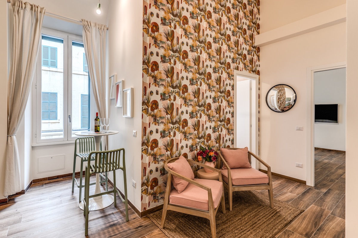 Light the large stone fire and relax with a book in this elegant home overlooking Via dei Banchi Nuovi. Coffered ceilings cap cozy rooms in relaxing, neutral tones accented by designer furnishings and owner's original paintings. This charming fully renovated house is located in one of the most beautiful, ancient and vibrant area of the center of the Eternal City. We also like to offer eco-sustainable hospitality: we use electricity from renewable sources, organic products.