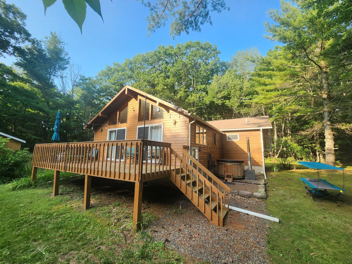 Spacious, peaceful lux cabin atop the Catskills. Enjoy mountain views, make smores, & soak in the hot tub. Catch up in the vaulted room by the fireplace w/ our wide game selection, while others watch movies downstairs. Host a dinner party with our fully equipped kitchen. Centrally located, 20 mins to 6 towns. Visit breweries, antique shops, dine, hike, fish, golf, or relax. Fast 600mbps internet. Perfect for groups, families, kids & pets. WFH, newborn, pet friendly. 3+ nights get discounted rate